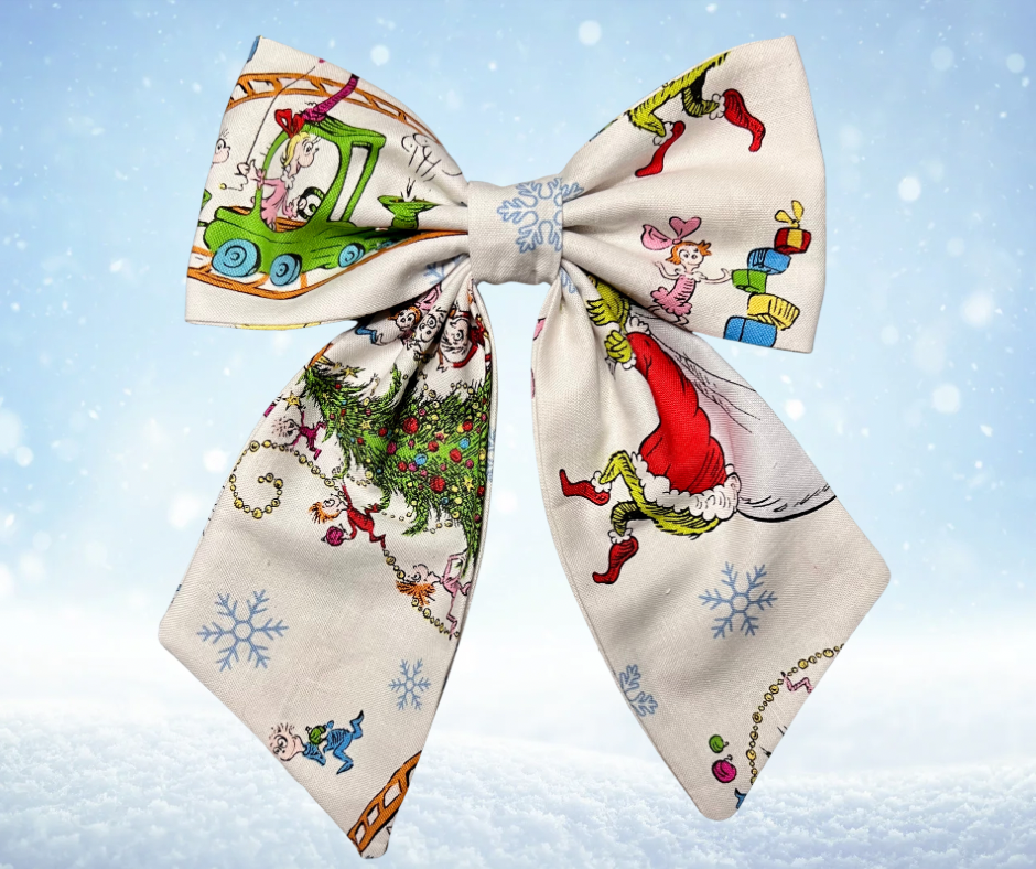 Lazo navideño inspirado en El Grinch, confeccionado a mano con tela de alta calidad y un diseño lleno de color y diversión. Perfecto para complementar peinados festivos o dar un toque único a tus looks navideños. Dale a tu look un toque travieso y festivo con este lazo del Grinch. El estampado puede variar según el corte de la tela… ¡y eso la hace especial y exclusiva!