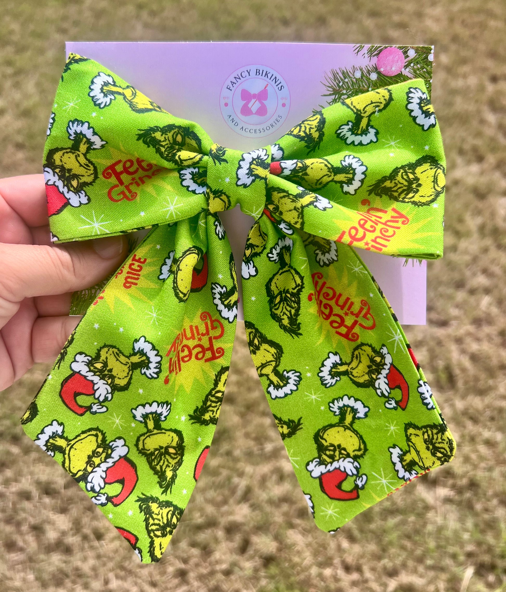 Lazo navideño inspirado en El Grinch, confeccionado a mano con tela de alta calidad y un diseño lleno de color y diversión. Perfecto para complementar peinados festivos o dar un toque único a tus looks navideños. Dale a tu look un toque travieso y festivo con este lazo del Grinch. El estampado puede variar según el corte de la tela… ¡y eso la hace especial y exclusiva!