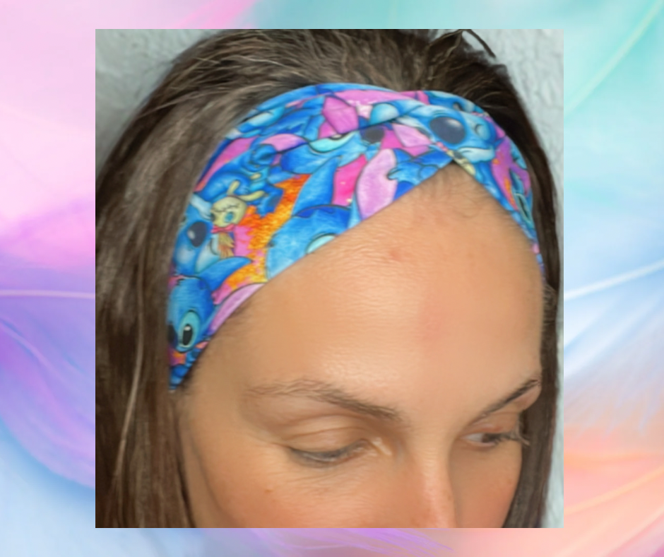 Cruzado al frente, confeccionada con tela elástica y suave. Tiene un estampado colorido con personajes de Stitch, en tonos azules, rosas y morados. Ideal para dar un toque divertido y original al peinado, manteniendo el cabello en su lugar con estilo y comodidad.